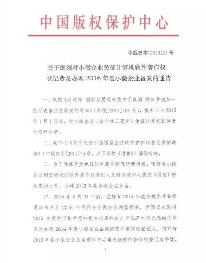 【通知】繼續(xù)對小微企業(yè)免征計算機軟件著作權登記費(中版權字 [2016] 21號)